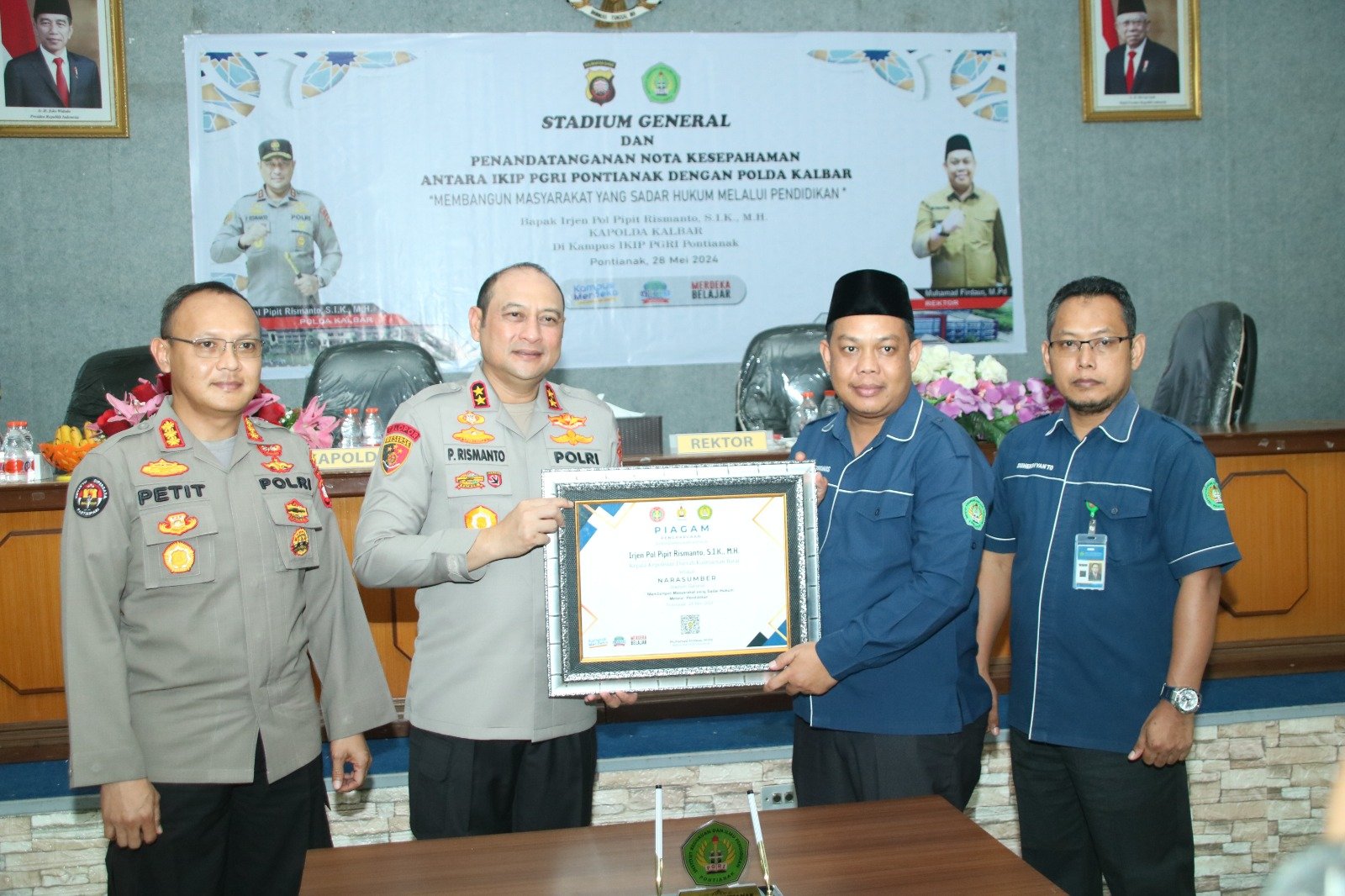 PONTIANAKMEDIA.ID, Pontianak, Polda Kalbar – Kapolda Kalbar Irjen Pol Pipit Rismanto, S.IK., M.H., melaksanakan penandatanganan MOU sekaligus memberikan Kuliah Umum di IKIP PGRI Pontianak pada hari Selasa (28/5).