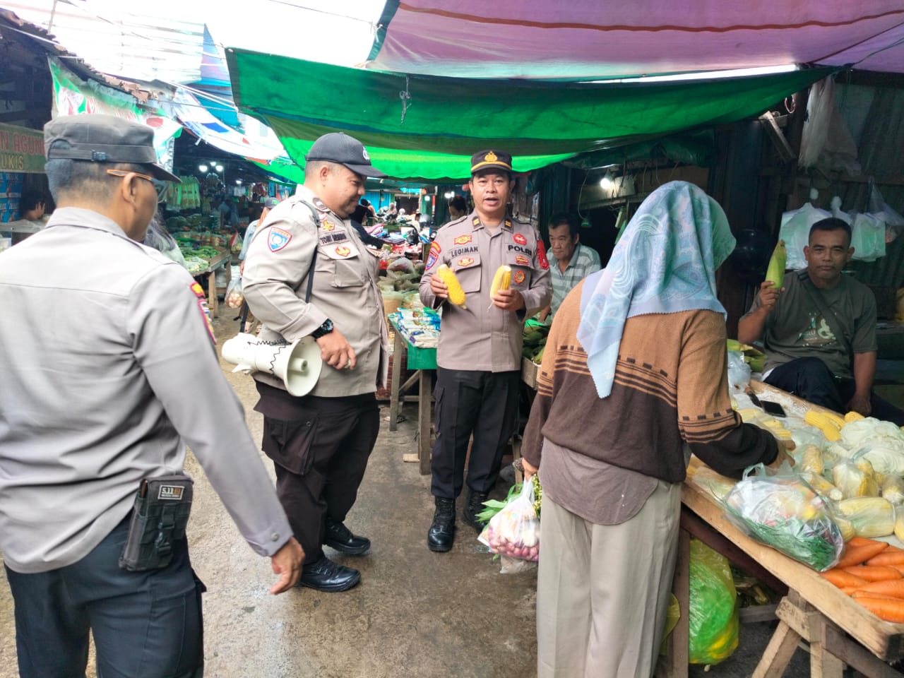 Dalam kegiatan tersebut, personel kepolisian tampak berinteraksi langsung dengan para pedagang dan pengunjung pasar. Dengan menggunakan megaphone, petugas memberikan edukasi mengenai kewaspadaan terhadap tindak kriminalitas seperti pencopetan dan peredaran uang palsu di tengah padatnya aktivitas pasar.