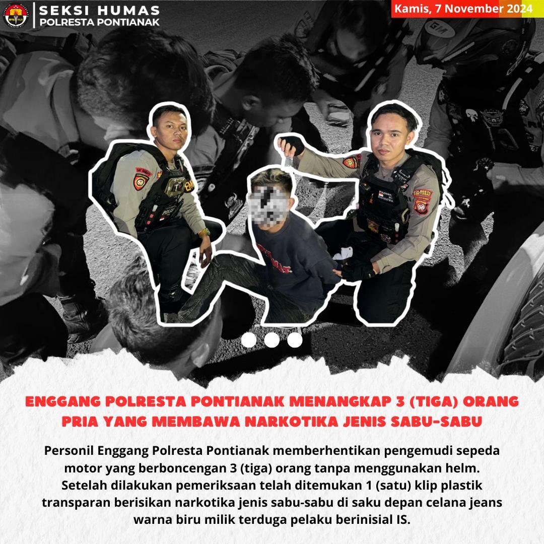 dan 2 orang temannya diamankan tim Enggang Samapta Polresta Pontianak pada hari Kamis (7/11/24) pukul 02.57 WIB dini hari di kawasan Jalan Sultan Muhammad Pontianak karena kedapatan menguasai narkotika jenis sabu.