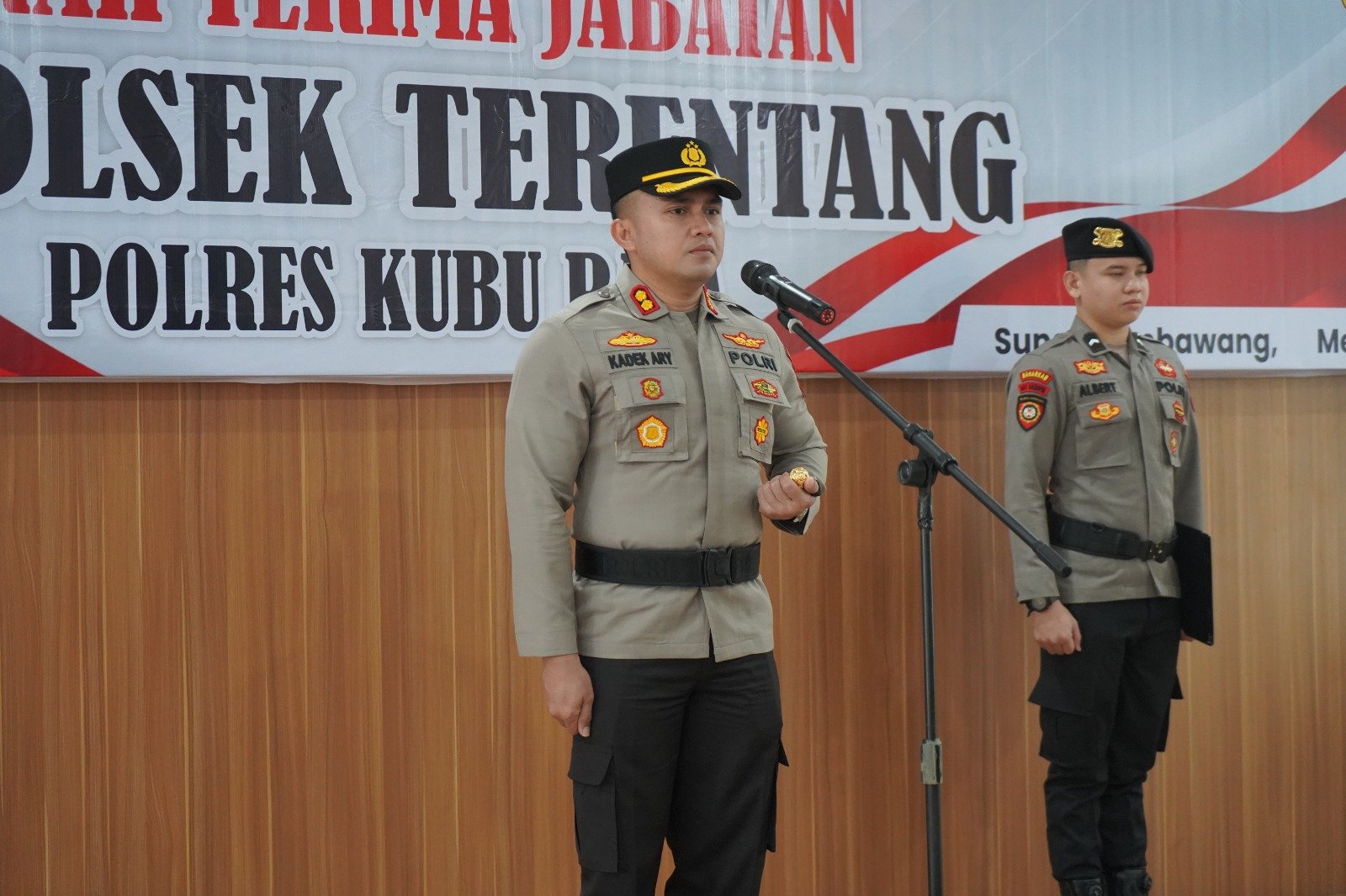 Pejabat yang melaksanakan sertijab yakni IPDA Slamet Widodo, S.H., M.H., dari jabatan lama Kapolsek Terentang Polres Kubu Raya menjadi Kapolsek Sungai Raya Kepulauan Polres Bengkayang. Sedangkan IPTU Melki, dari jabatan lama Kanit Samapta Polsek KMB Polres Kubu Raya menjadi Kapolsek Terentang Polres Kubu Raya.