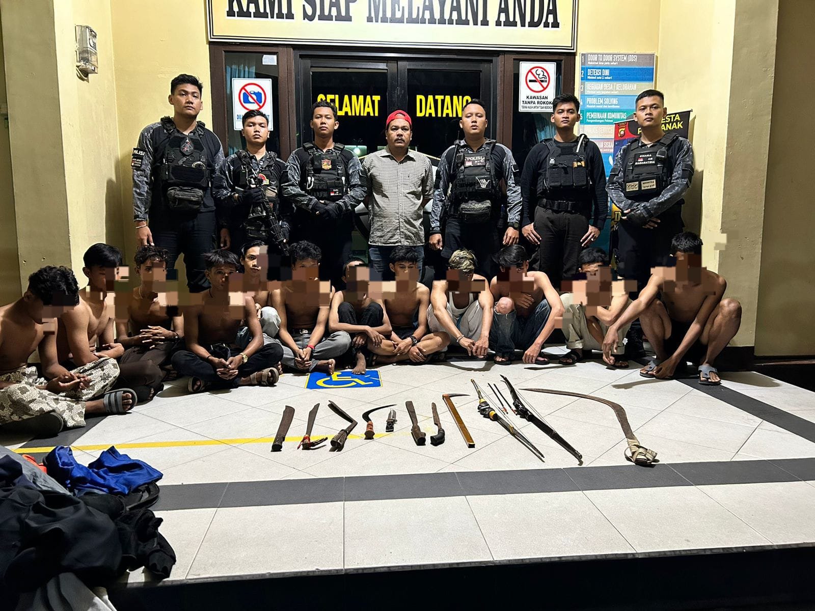 “Setelah melihat sekitar 12 anak renaja yang sedang berkumpul di Jalan Kom Yos Sudarso depan Gang Teratai kelurahan Sungai Jawi Dalam Pontianak Selatan yang mana remaja tersebut membawa berbagai benda berbahaya seperti senjata tajam dan busur serta anak panah yang akan digunakan untuk tawuran dan kemudian 12 remaja tersebut diamankan di Polsek Pontianak Barat ,” ungkap Kapolsek dalam keterangannya.