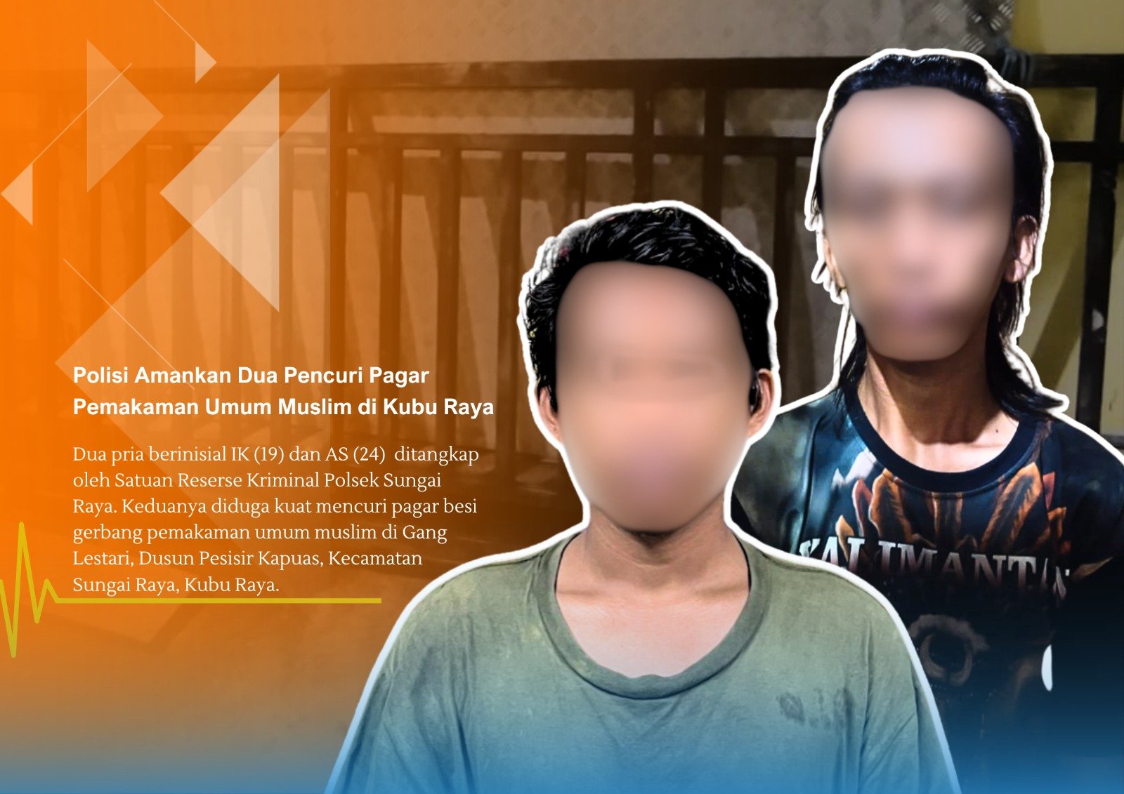 PONTIANAKMEDIA.ID, KUBU RAYA – Dua pria berinisial IK (19) dan AS (24) harus berurusan dengan pihak berwajib setelah ditangkap oleh Satuan Reserse Kriminal Polsek Sungai Raya. Keduanya diduga kuat mencuri pagar besi pemakaman umum muslim di Gang Lestari, Dusun Pesisir Kapuas, Kecamatan Sungai Raya, Kubu Raya.