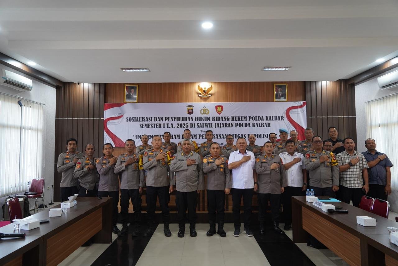 KUBU RAYA – Bidang Hukum (Bidkum) Polda Kalbar menggelar Sosialisasi Penyuluhan Hukum Semester I Tahun Anggaran 2025 di Aula Polres Kubu Raya. Kegiatan ini bertujuan untuk meningkatkan pemahaman hukum bagi personel kepolisian, terutama terkait implementasi Hak Asasi Manusia (HAM) dalam tugas kepolisian serta mekanisme pengajuan perceraian bagi anggota Polri. Selasa (18/2) pagi