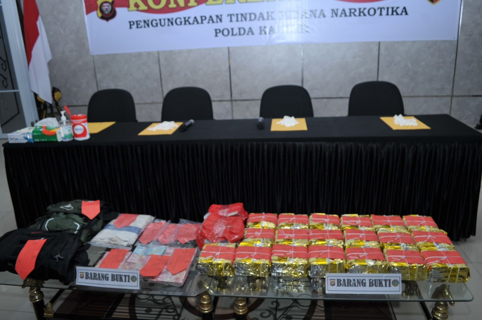 Polda Kalbar Gelar Jumpa Pers Ungkap Tindak Pidana Narkotika Jaringan Internasional Malaysia – Indonesia dengan menangkap 4 pelaku dan mengamankan Barang Bukti sebanyak 18.994,84 gram Sabu