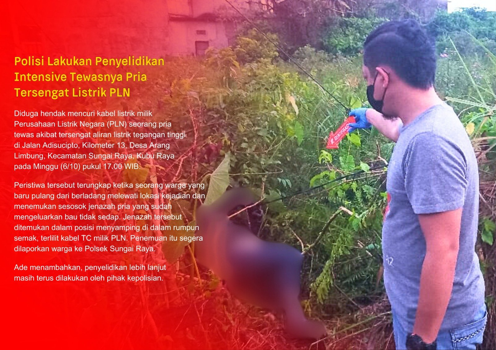 PONTIANAKMEDIA.ID, KUBU RAYA – Diduga hendak mencuri kabel listrik milik Perusahaan Listrik Negara (PLN) seorang pria tewas akibat tersengat aliran listrik tegangan tinggi di Jalan Adisucipto, Kilometer 13, Desa Arang Limbung, Kecamatan Sungai Raya, Kubu Raya pada Minggu (6/10) pukul 17.00 WIB.
