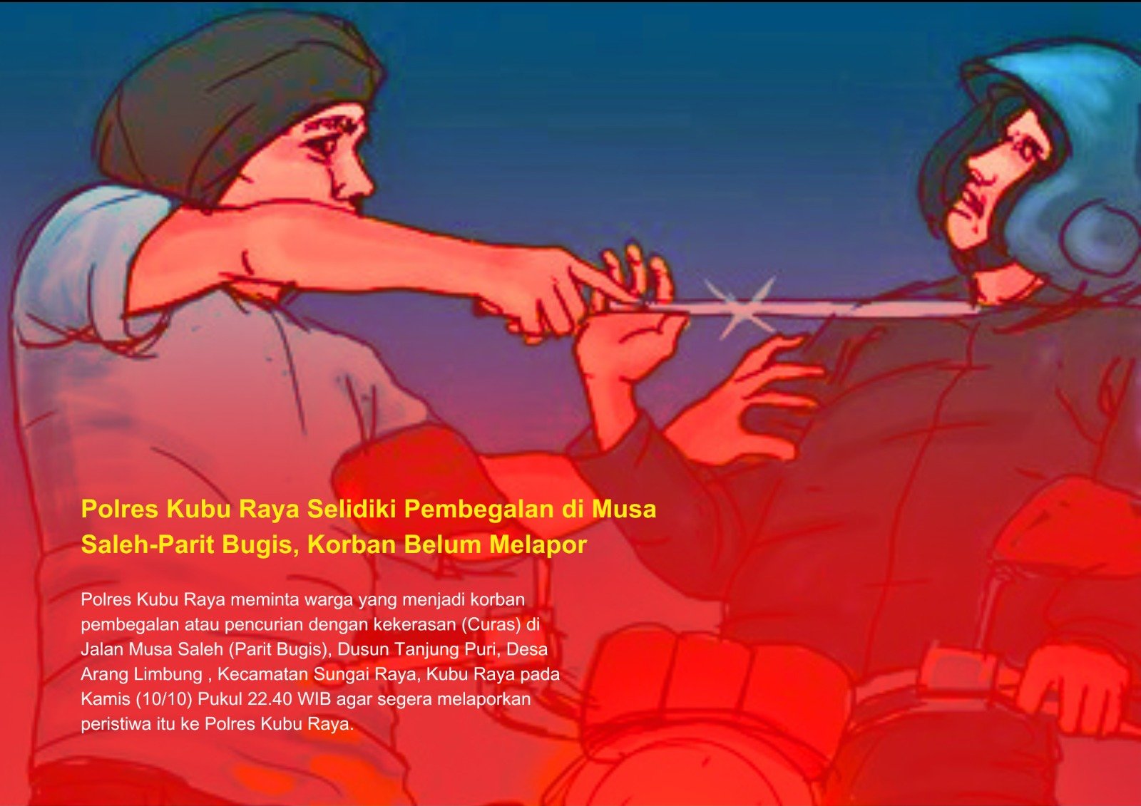 PONTIANAKMEDIA.ID, KUBU RAYA – Polres Kubu Raya meminta warga yang menjadi korban pembegalan atau pencurian dengan kekerasan (Curas) di Jalan Musa Saleh (Parit Bugis), Dusun Tanjung Puri, Desa Arang Limbung , Kecamatan Sungai Raya, Kubu Raya pada Kamis (10/10) Pukul 22.40 WIB agar segera melaporkan peristiwa itu ke Polres Kubu Raya.