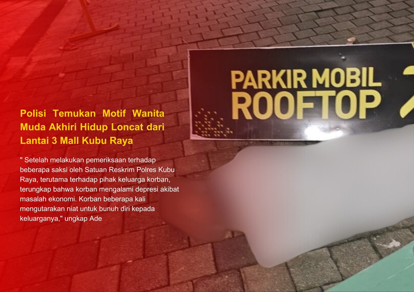 PONTIANAKMEDIA.ID, KUBU RAYA – Seorang wanita berusia 38 tahun asal Tanjung Duren, Kecamatan Grogol Petamburan, Jakarta Barat, ditemukan tewas di lantai dasar parkiran Mall Kubu Raya pada Selasa (1/10). Berdasarkan hasil pemeriksaan saksi dan keterangan dari keluarga, masalah ekonomi diduga kuat menjadi penyebab aksi nekat Y melompat dari lantai 3 mall tersebut.