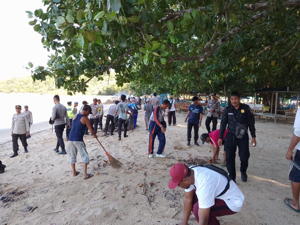 Kerja bakti bersama anggota Polres dengan sukarelawan dan warga sekitar Pantai, terlaksana dengan baik dan menjadikan situasi aman kondusif