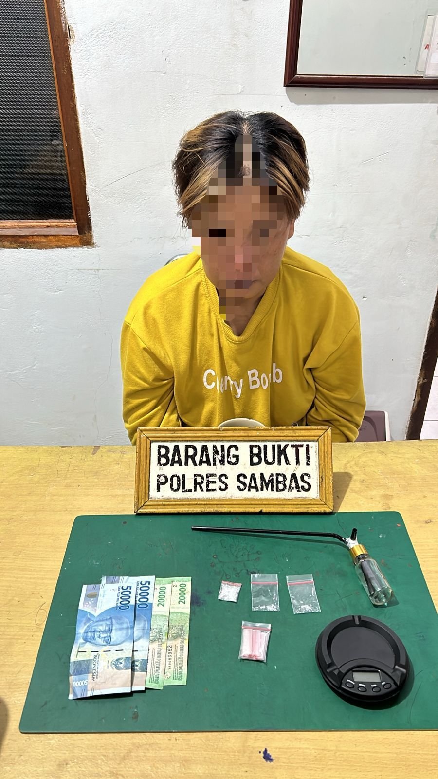 Kapolres Sambas Akbp Sugiyatmo S.I.K melalui Kasi Humas Polres Sambas Akp Sadoko bahwa Penangkapan dilakukan oleh Satuan Reserse Narkoba Polres Sambas yang dipimpin langsung oleh Kasat Resnarkoba Iptu Agus Trisumarsono setelah melakukan penyelidikan. KS ditangkap di rumahnya dan ditemukan barang bukti tiga paket plastik klip berisi butiran kristal putih yang diduga narkotika jenis shabu dan setelah diukur timbang seberat bruto 1,66 gram, selain itu juga ditemukan timbangan digital, plastik klip kosong, handphone, alat hisap, dan uang tunai sebesar Rp140.000.