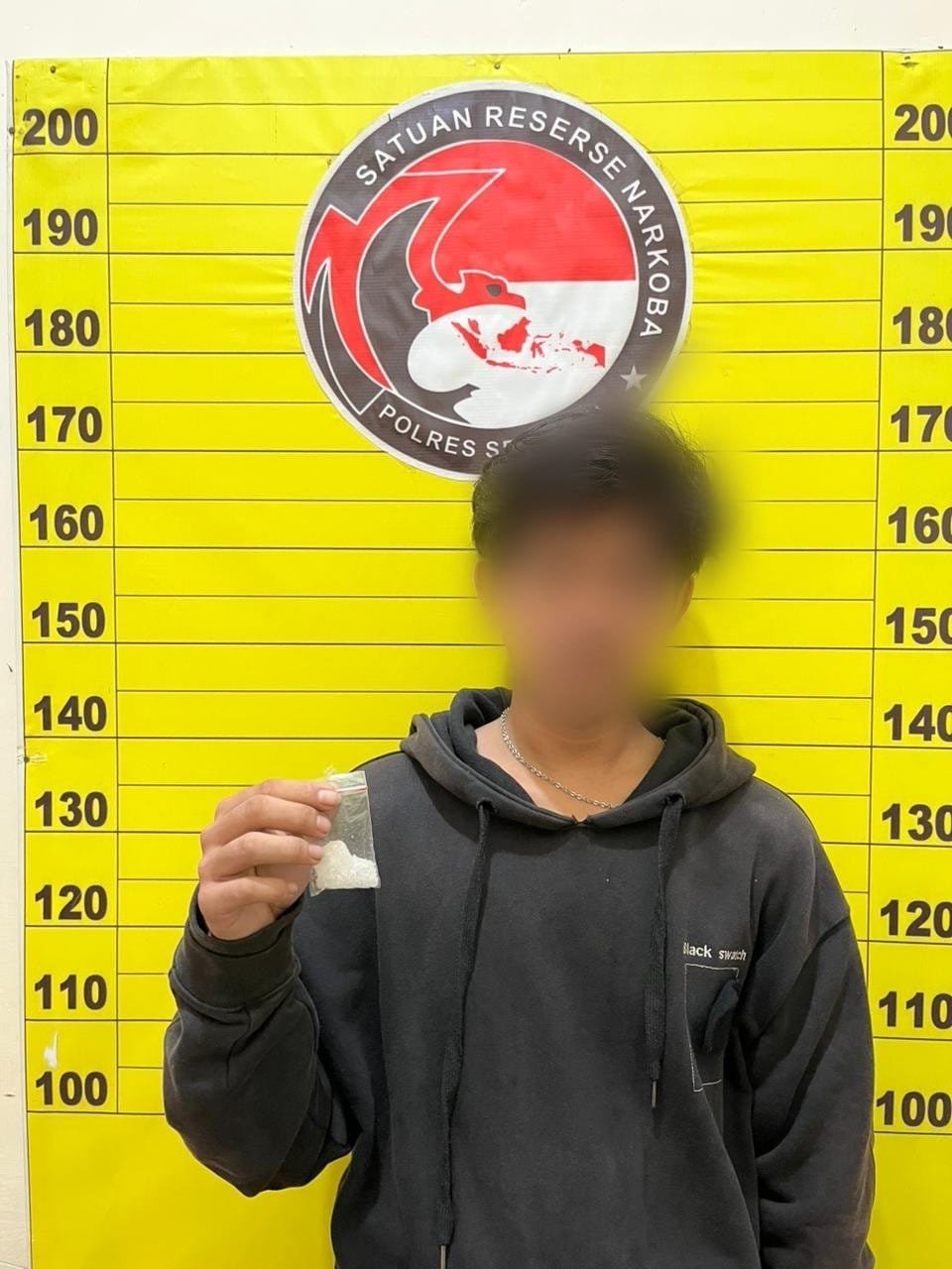 Saat dilakukan penggeledahan yang disaksikan oleh saksi, Polisi menemukan sebuah bungkus rokok yang di dalamnya terdapat satu plastik klip berisi kristal putih yang diduga sabu. Barang bukti tersebut dibungkus dengan potongan plastik hitam.